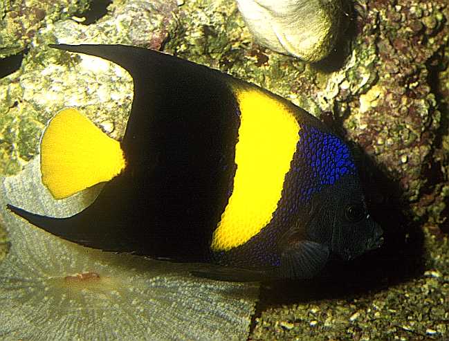 Um fiskinn: Tígullegur engill. Áður sjaldséður og dýr en núna algengari (sjá neðri myndir). Mjög hlédrægur í fyrstu og felugjarn og getur tekið nokkrar vikur að fá hann til að éta. Þarf góða felustaði og mjög góð vatnsgæði. Getur verið yfirgangssamur við suma aðra engla. Hafður stakur í búri. Ungviðið er töluvert öðruvísi útlits (sjá efstu mynd). Miðlungs harðger fiskur fyrir lengra komna. Getur nartað í kóralla og hryggleysingja.