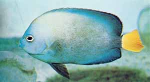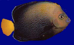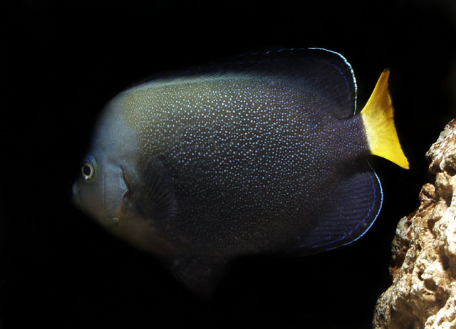 Um fiskinn: Sérstæður smáengill þakinn litlum bláum doppum (sjá neðri myndir). Englar af þessari ættkvísl eru eftirsóttir búrafiskar. Þeir eru ágætlega harðgerðir, nokkuð fljótir að aðlagast og tiltölulega rólegir. Þeir eru mjög hlédrægir og dulir og þurfa því rólega búrfélaga og fjölmarga felustaði. Nærist á brúnum þráðþörungum og kísilþörungum. Ungviðið er ljósara í útliti (sjá efstu mynd). Ekki sérlega reef-safe. Getur átt til að narta í kóralla og hryggleysingja. Passar best í vel þroskuðu búri.