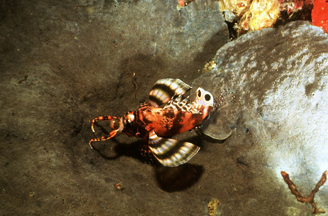 Um fiskinn: Fallegur lítill ljónafiskur með tveim augnblettum í bakugganum. Oft getur verið erfitt að fá til að éta í fyrstu. Hann þarf marga felustaði, enda í eðli sínu næturdýr. Bestur stakur en má hafa nokkra saman í 280 l búri eða stærra. Þá er best að hafa einn stóran og nokkra minni. Vill oft eingöngu lifandi fóður og má því ekki vera í búri með matgráðugum fiskum sem éta allt frá honum. Ekki reef-safe, enda rækjur og skelfiskur á matseðlinum. Þarf góð vatnsgæði og er sæmilega harðgerður, en sístur þó af öðrum sem nefndir eru á síðunni. Er með eiturbrodda í bakugganum sem valdið geta sárum sting.