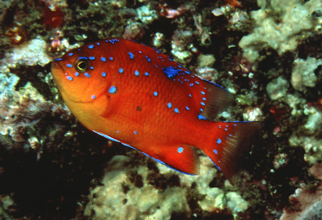 Um fiskinn: Gullfallegur og dýr damselfiskur sem mjög er sóst eftir að eiga. Hann er verndaður með lögum í Kaliforníu þar sem hann á heim- kynni í þangbreiðunum. Þetta er harðgerður og stórvaxinn fiskur sem þarf auðvitað mjög stórt búr. Ungviðið (efsta mynd) er sérlega flott með skærbláum doppum á appelsínugulum bakgrunni. Best að hafa stakan eða í pari. Grimmir og vernda svæði sitt með kjafti og klóm. Sæmilega reef-safe en getur átt til í að narta í skeldýr. Getur fjölgað sér í búri.