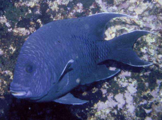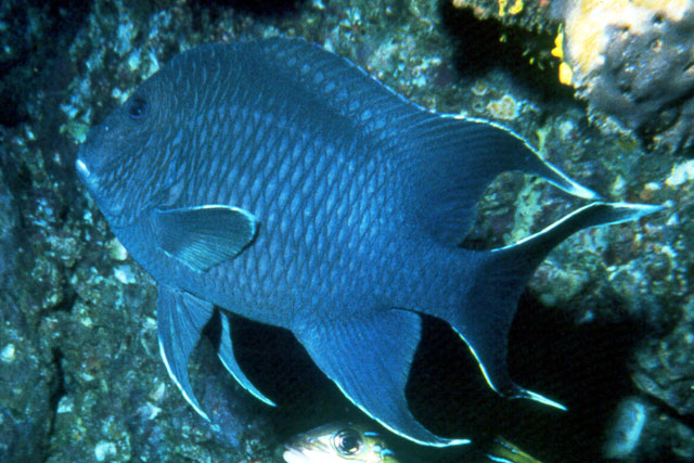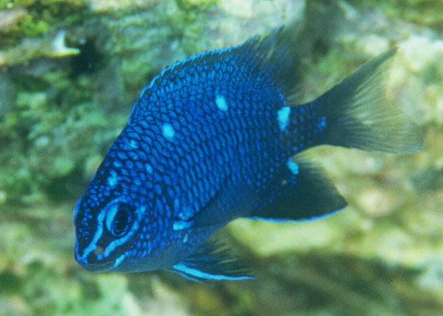 Um fiskinn: Mjög stór, kraftmikill og harðger damsel. Ungviðið er dökkblátt með ljósbláum doppum á búk (neðsta mynd). Fullvaxta fiskur er dökkblár með ljósbláum útlínum. Hentar helst í stóru búri með grimmari fiskum því að hann verður mjög yfirgangssamur með aldrinum. Bestur stakur hvort heldur fullvaxta eða ungviði, eða í pari. Þarf gott búr, hreint vatn og marga felustaði. Mjög harðgerður og reef-safe. Ungviði plokkar pöddur af öðrum fiskum.