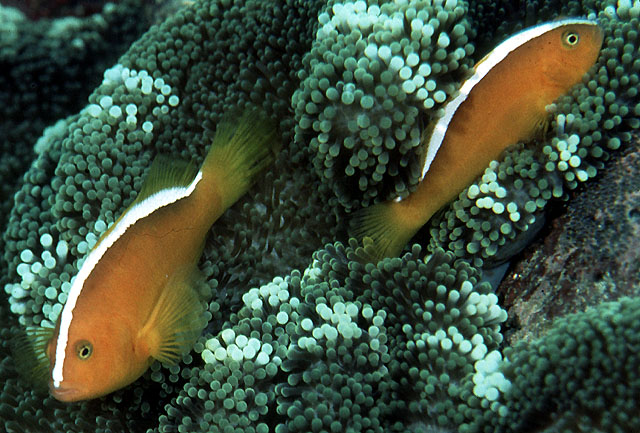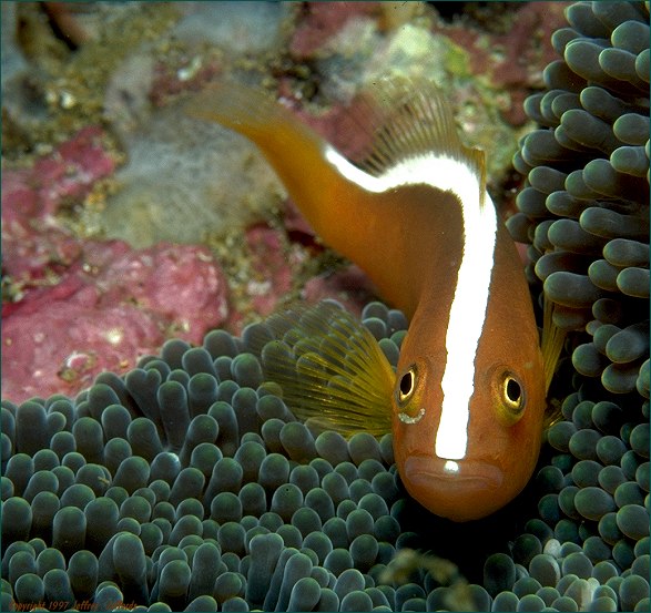 Um fiskinn: Mjög fagur trúður sem dafnar smærri búrum. Vilt eintök eru gjörn á að sýkjast af trúðfiskaveiki (Brooklynella hostilis) og því betra að kaupa ræktaða fiska ef hægt er. Appelsíngulur með breiða hvíta blesu frá trýni eftir öllu bakinu. Stórar hrygnur geta verið mjög grimmar gagnvart eigið kyn. Þurfa gott búr með nóg af felustöðum og góð vatnsskilyrði. Harðgerður fiskur og reef-safe. Bestur stakur eða í pari. Stærri fiskur í pari verður kvenkyns og sá minni karlkyns. Sækir í sæfíflana Heteractis crispa og Stichodactyla mertensii. Getur fjölgað sér í búri, helst með sæfífli.