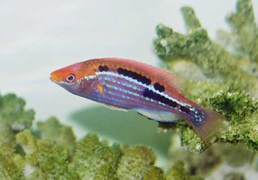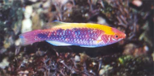 Um fiskinn: Litfagur lítill wrassi sem hentar vel í kórallabúri. Hann er alveg reef-safe og plummar sig vel með rólegum fiskum. Má hafa nokkra saman í búri þ.e. einn hæng og allt að 4 hrygnur. Tveir hængar mega ekki vera saman nema í mjög rúmgóðu búri. Getur líka verið stakur. Best er að setja fiskana í búrið á sama tíma. Hann er bleikfjólublár á búk með gult bak. Duglegur hreinsifiskur og matfrekur. Getur verið lengi að aðlagast. Búrið þarf að vera rúmgott með nóg af felustöðum og vatnsgæði góð. Þetta er harðgerður fiskur, auðveldur og mjög litríkur sem laðar fram aðra feimnari fiska. Breytilegur eftir svæðum. Frá Balí (efsta mynd) og frá Indónesíu (mið mynd).