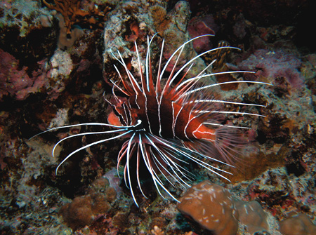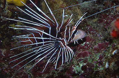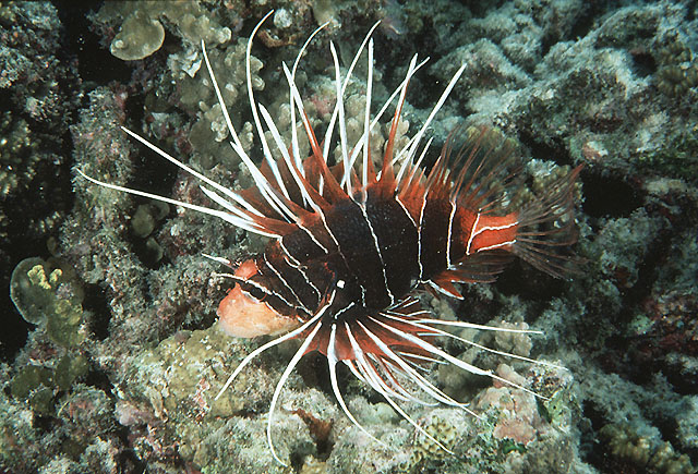 Um fiskinn: Algengur í Rauðahafi en sjaldséðari og eftirsóttari í búrum en frændi hans P. antennata. Mjög fallegur með breiðum rauðum búkböndum og þunnum hvítum línum á milli. Nokkuð harð- gerður og aðlögunargóður. Bestur stakur eða í pari með stærri fiskum en ekki grimmum sem gætu truflað fæðuöflun hans. Þarf að hafa nóg af felustöðum. Lætur lítið fyrir sér fara á daginn en veiðir frekar að næturlagi. Étur flest sem upp í hann kemst og þar af leiðandi ekki reef-safe. Nærist aðallega á kröbbum og rækjum í náttúrunni. Þarf góð vatnsgæði og straum. Er með eitraða brodda sem valdið geta sárum sting.