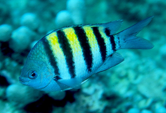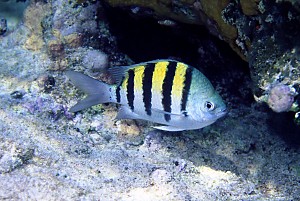 Um fiskinn: Fallegur röndottur damselfiskur. Hann er harðgerður og auðveldur. Getur verið nokkuð yfirgangssamur við skyldar tegundir og rólyndari. Bestur stakur eða í pari. Ungviði heldur sér í torfum innan um kóralla, oft nokkur hundruð saman (mið mynd). Það kemur jafnvel upp hreinsistöðvum þangað sem aðrir fiskar leita í aflúsun. Þurfa gott búr, hreint vatn og marga felustaði. Eru reef-safe og harðgerðir. Fínir byrjendafiskar.