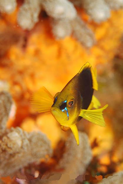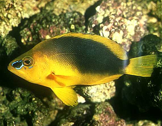 Um fiskinn: Harðgerður og fallegur gulleitur fiskur með stórt dökk svæði á baki og sjálflýsandi blár línur í andliti. Hentar ekki í reef búri þar eð hann getur étið skrautrækjur og smáfiska. Bestur stakur eða tveir í stóru búri (210 l) með mörgum felustöðum. Eldri fiskar eiga erfiðara með að aðlagast en yngri fiskar. Verða þá felugjarnir og neita að nærast. Ágætir byrjendafiskar sem þurfa að vera með rólegum fiskum. Þurfa hreint vatn og góðan straum.