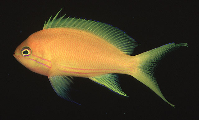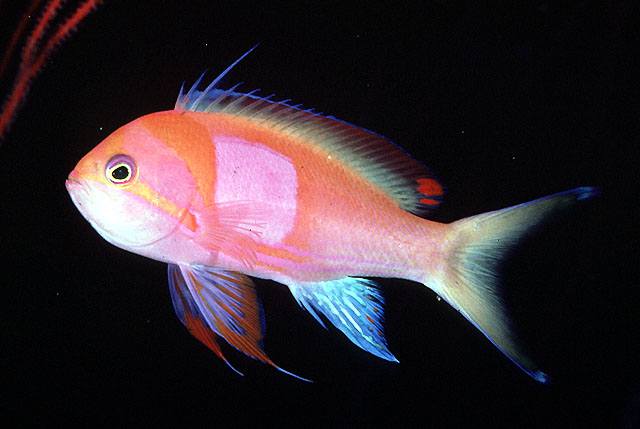 Um fiskinn: Mjög fallegur og gíðarlega litsterkur fiskur sem hentar vel í reef búri. Hrygnan er glansandi gul (efsta mynd) en hængurinn fagur appelsínugulur (neðsta mynd) og jafnvel rauður (mið mynd) með bleikan ferhyrning á miðjum búknum. Hann er nokkuð harðgerður og bestur stakur eða einn hængur á móti 5-6 hrygnum ef búrið er nógu stórt (510 l búr). Þarf að hafa nóg af felustöðum og góðan straum. Reef-safe. Þarf góð vatnsgæði og lítinn straum. Kýs helst að vera í lítilli birtu. Tekur fiskinn góðan tíma að venjast nýju búri. Berst við skylda fiska. Passa að hafa nóg af felustöðum.