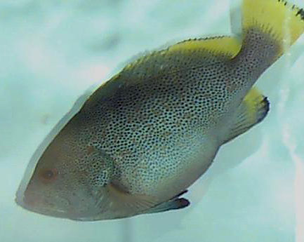 Um fiskinn: Stór, gráleitur grouper með þéttum dökkum dílum og gulum eyruggum og sporði. Uggarnir vera gulari með aldrinum. Þetta er mikill fiskur sem hentar eingöngu í allra stærstu búr. Vex hratt og er fljótur að vaxa upp úr heimkynnum sínum. Þetta er harðgerður mathákur sem étur allt er á tönn festir. Hann er bestur einn í búri og getur auðveldlega gleypt búrfélaga sína í heilu lagi. Þarf mjög stórt og rúmgott búr með öflugri dælingu og hreinsibúnaði þar eð honum fylgir mikill úrgangur. Ekki reef-safe. Hentar eingöngu í stórfiskabúri með öðrum stórum kjötætum og ránfiskum.