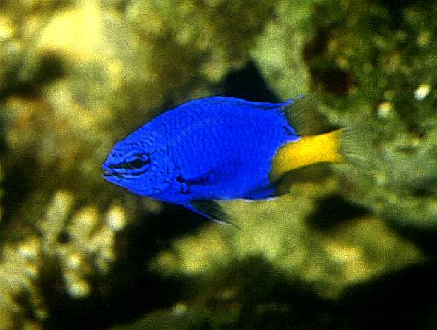 Um fiskinn: Gullfallegur og tiltölulega rólegur damselfiskur. Hann er djúpblár með gulan sporð og spyrðil. Fínn byrjendafiskur sem má hafa í smáhópum í miðlungsstóru búri með nóg af felustöðum. Hafa má par í minna búri og þau geta hrygnt oft og mörgum sinnum. Nærist á dýrasvifi og þráðþörungum en lætur botndýr vera. Ætti ekki að hafa með grimmari fiskum svo sem ýmsum öðrum damseltegundum. Þarf gott búr, hreint vatn og marga felustaði. Reef- safe.